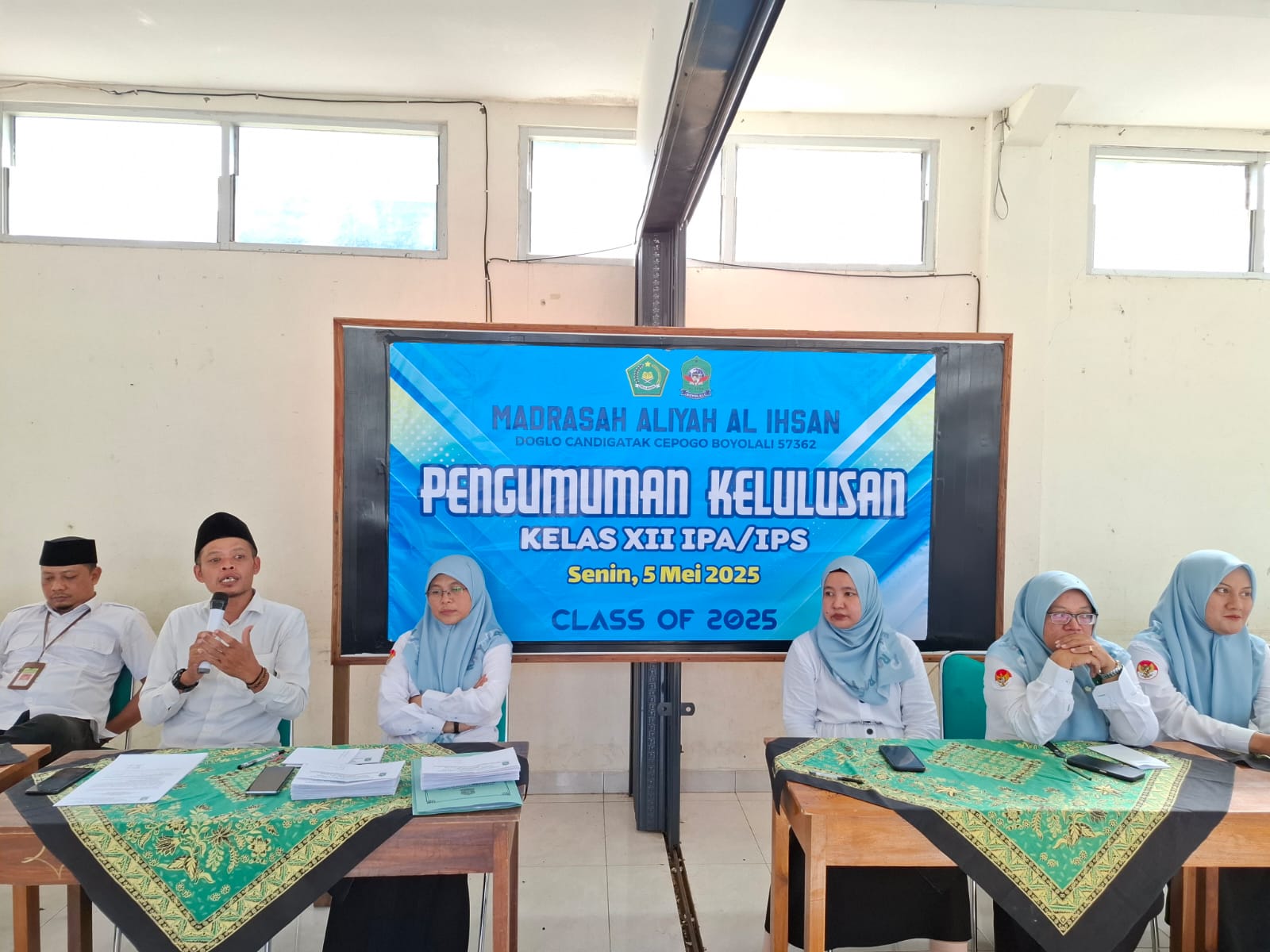 Madrasah Aliyah (MA) Al Ihsan Doglo kembali menorehkan sejarah dengan meluluskan 54 siswa-siswi Kelas XII tahun ajaran 2024/2025. Momen penuh haru dan kebanggaan ini berlangsung dalam sebuah acara pengumuman kelulusan yang diselenggarakan di Aula MA Al Ihsan pada pukul 14.00 – 16.00 WIB (Boyolali, 05 Mei 2025).