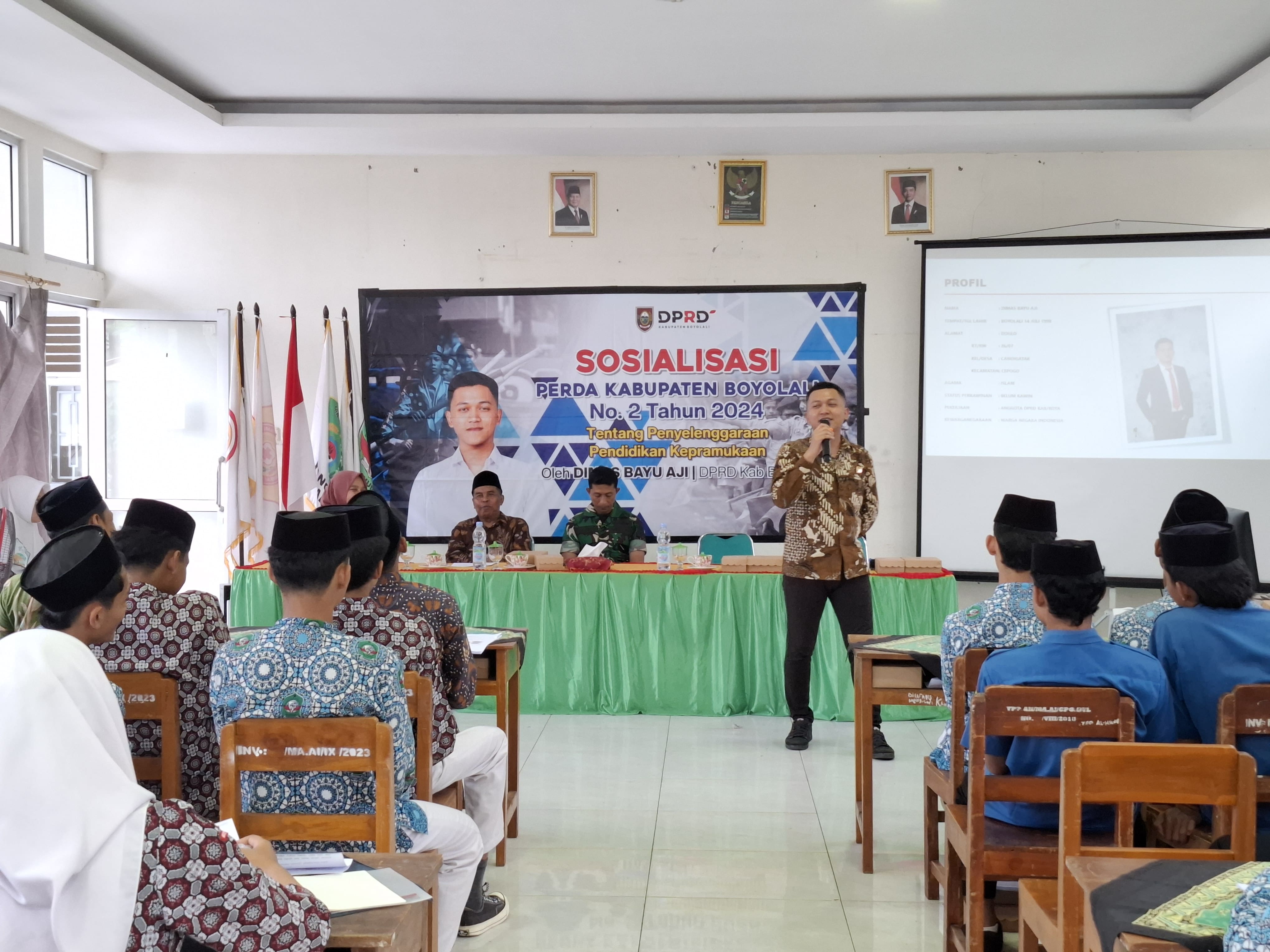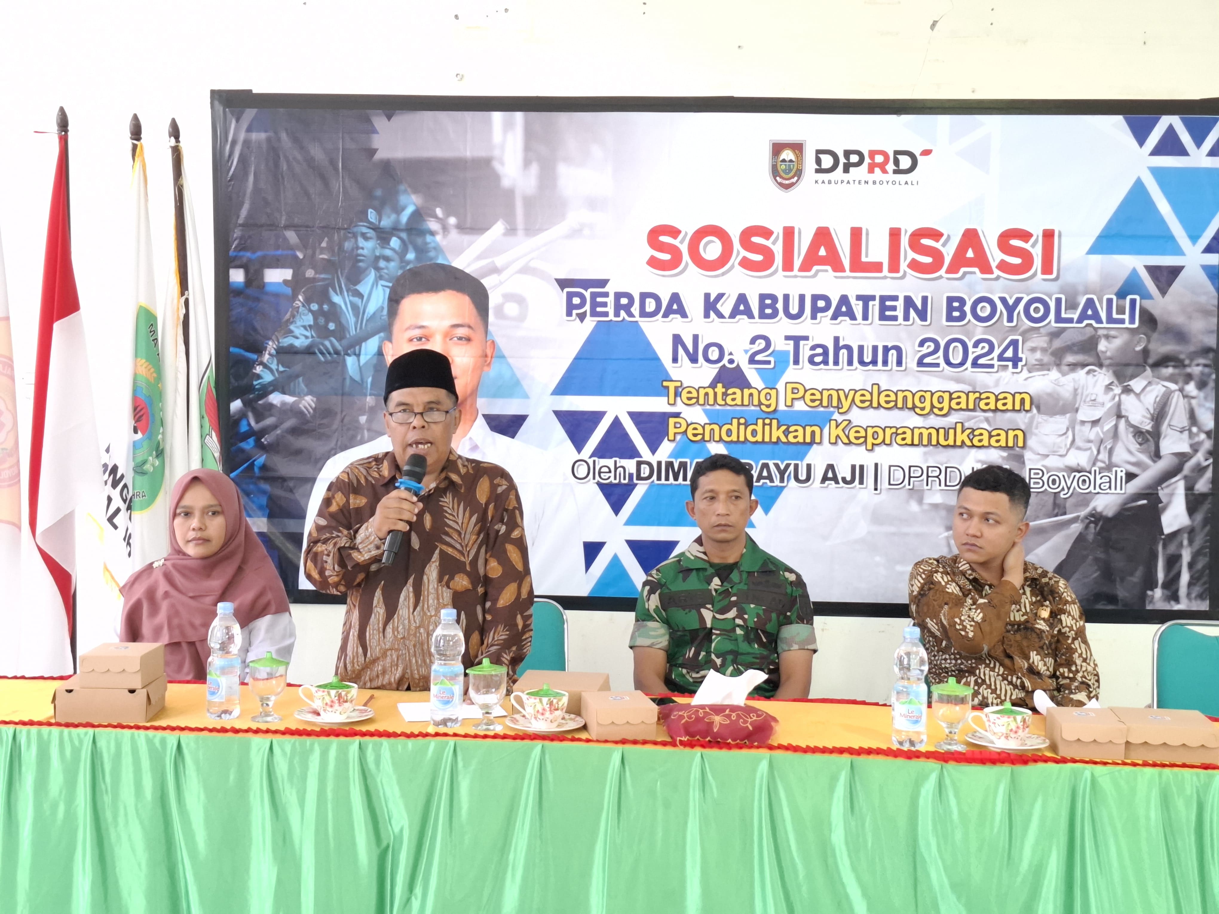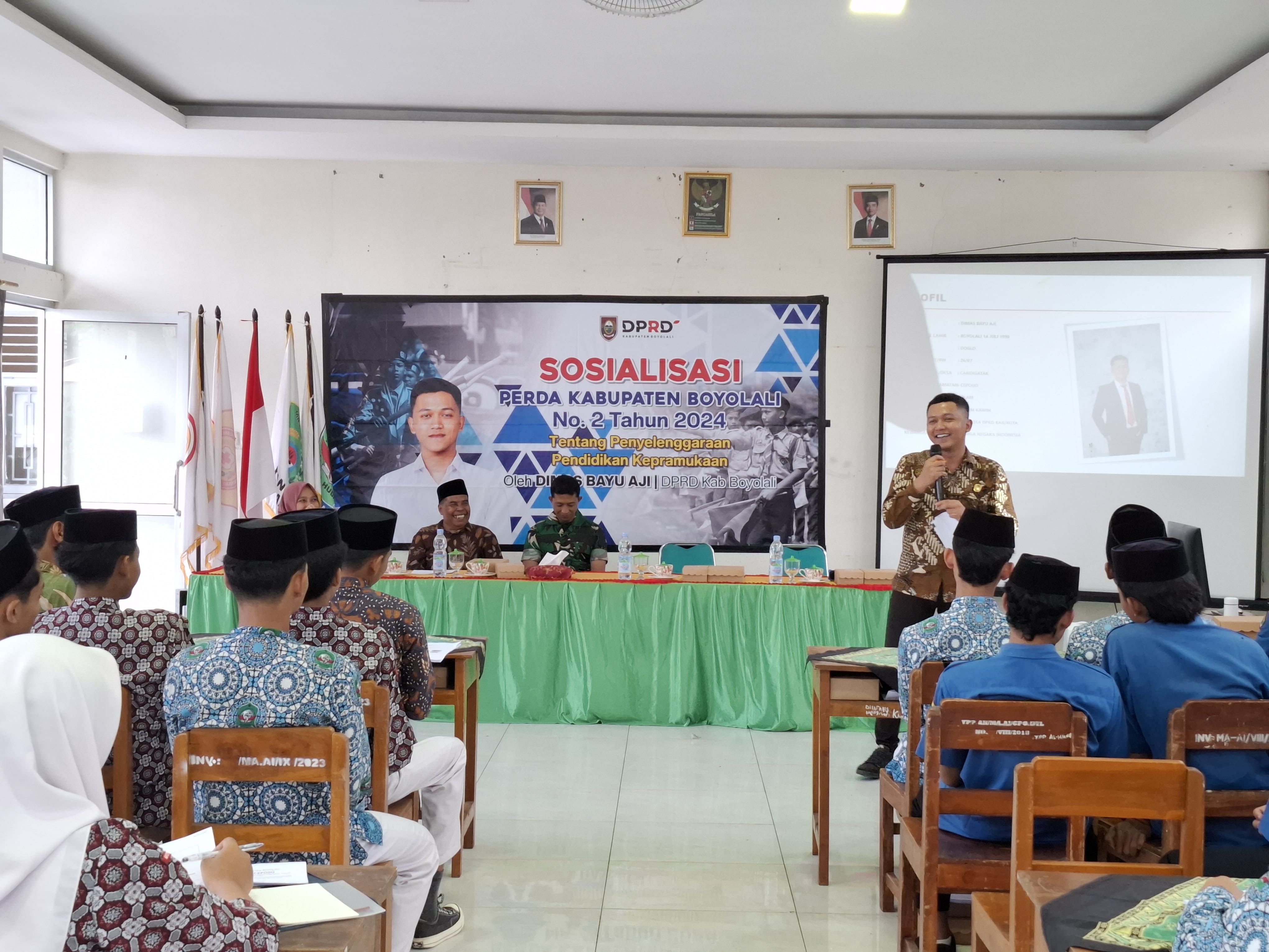 Boyolali, 07 Mei 2025 — Dalam upaya meningkatkan pemahaman dan pelaksanaan pendidikan kepramukaan yang lebih terstruktur dan sistematis, Anggota DPRD Kabupaten Boyolali Komisi II, Dimas Bayu Aji, menyampaikan sosialisasi Peraturan Daerah (Perda) Nomor 2 Tahun 2024 tentang Penyelenggaraan Pendidikan Kepramukaan. Kegiatan ini menjadi bagian dari agenda Sosialisasi Peraturan Perundang-undangan Kabupaten Boyolali Tahun 2025 yang digelar di Aula Madrasah Aliyah (MA) Al Ihsan Doglo.