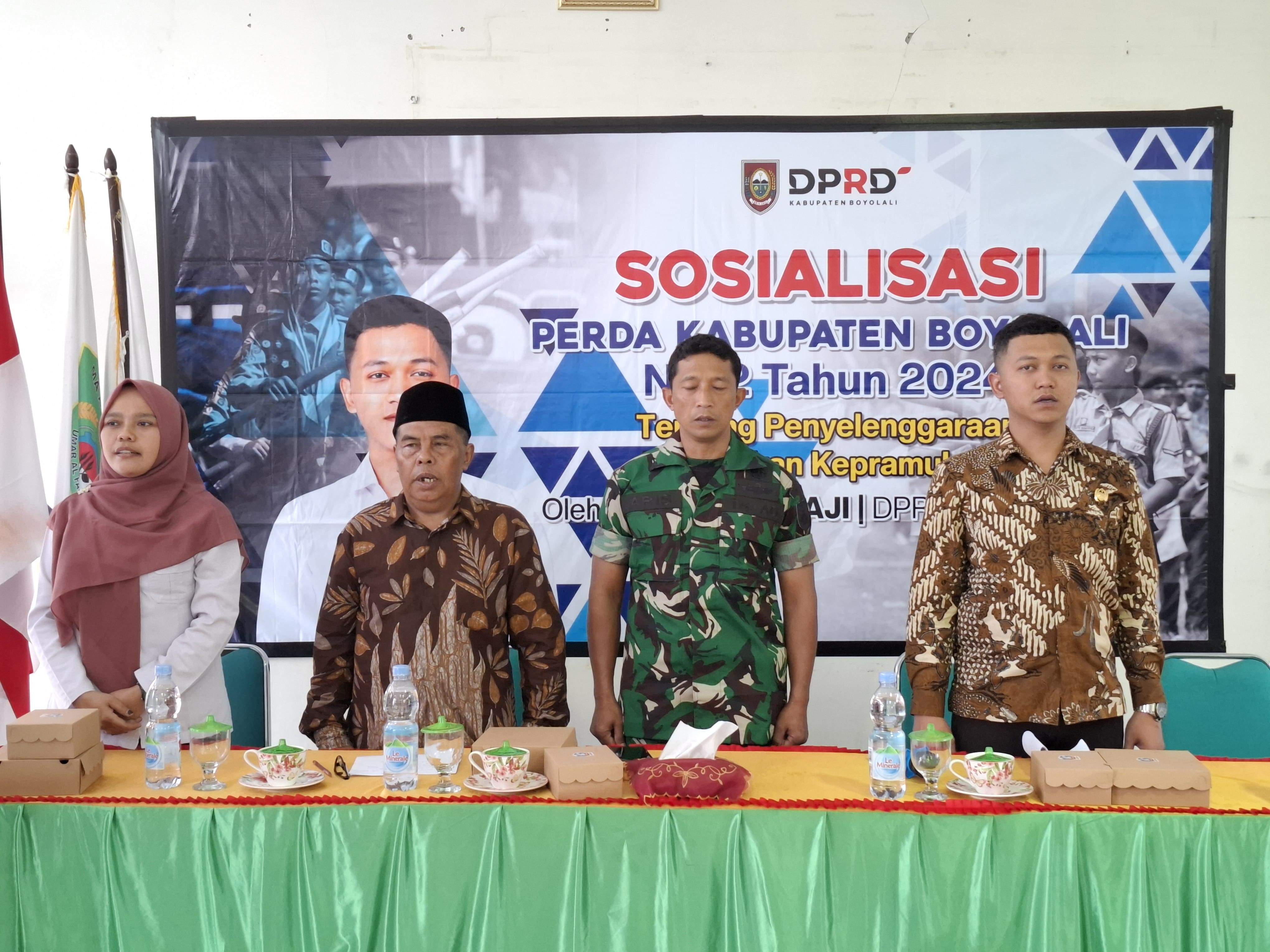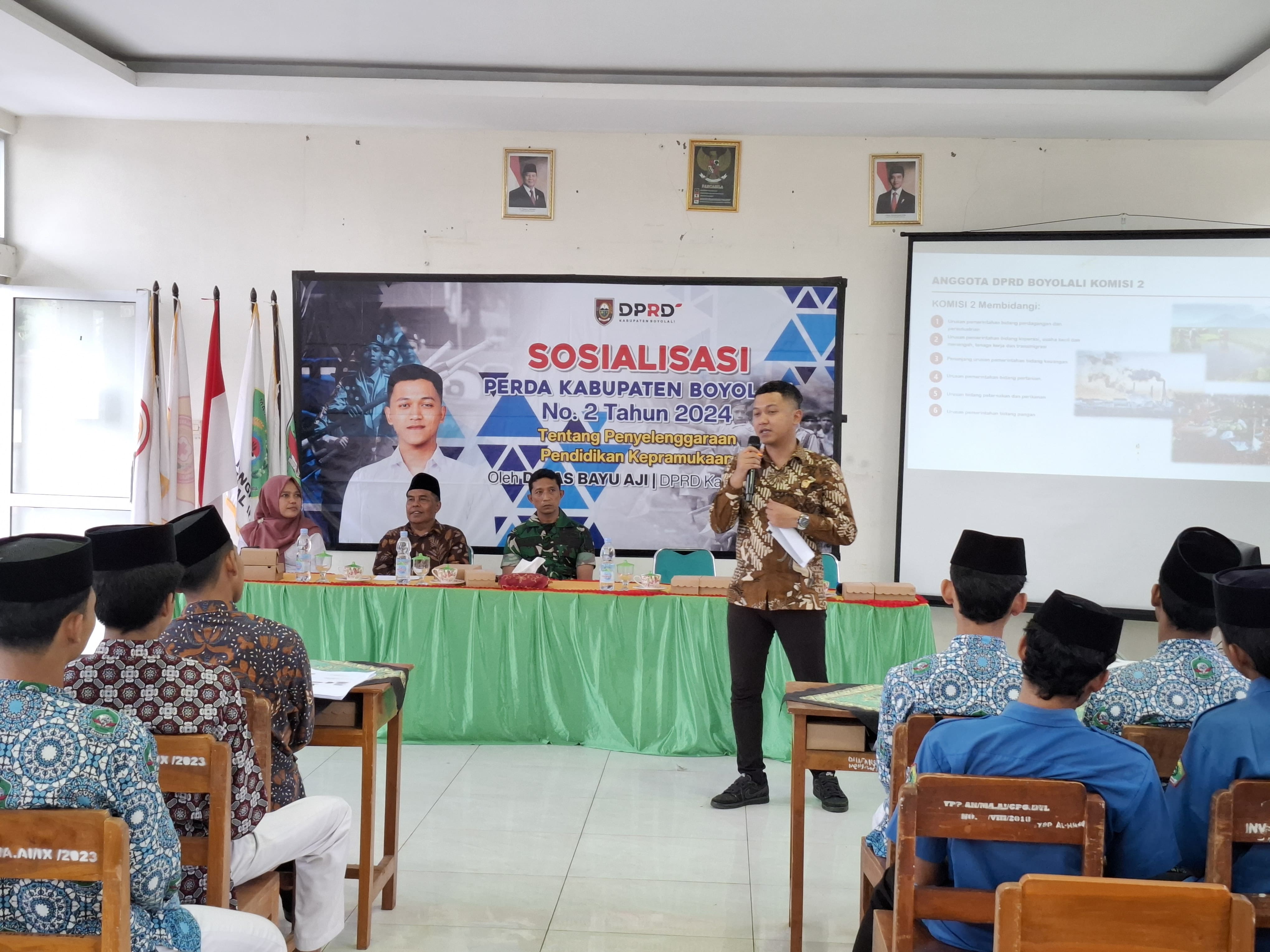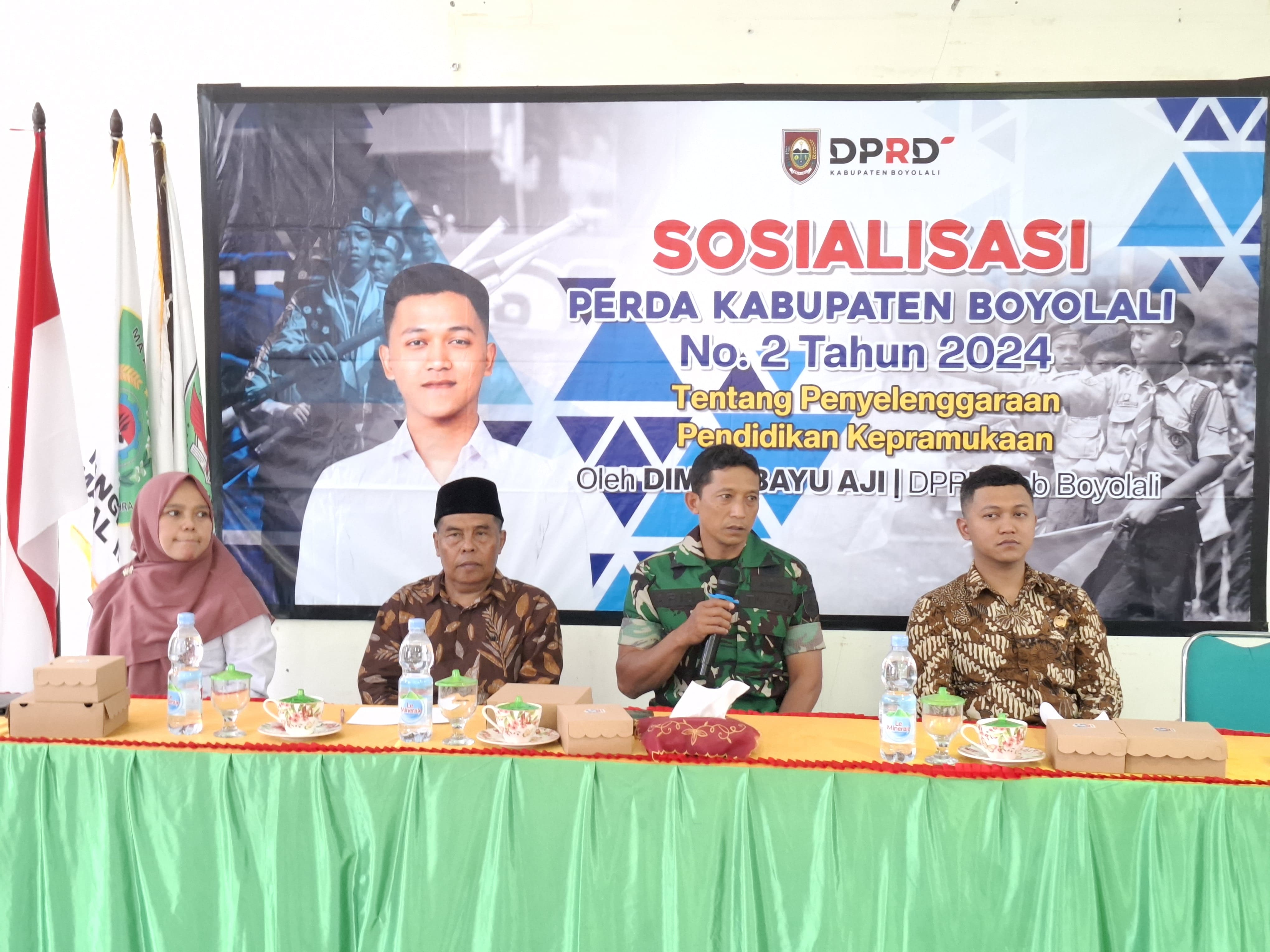 Boyolali, 07 Mei 2025 — Dalam upaya meningkatkan pemahaman dan pelaksanaan pendidikan kepramukaan yang lebih terstruktur dan sistematis, Anggota DPRD Kabupaten Boyolali Komisi II, Dimas Bayu Aji, menyampaikan sosialisasi Peraturan Daerah (Perda) Nomor 2 Tahun 2024 tentang Penyelenggaraan Pendidikan Kepramukaan. Kegiatan ini menjadi bagian dari agenda Sosialisasi Peraturan Perundang-undangan Kabupaten Boyolali Tahun 2025 yang digelar di Aula Madrasah Aliyah (MA) Al Ihsan Doglo.